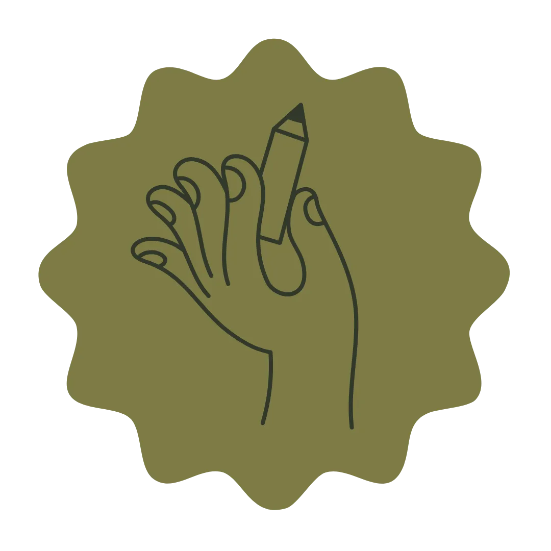 Playful, line-drawn illustration of a hand emerging from a hole, holding a paintbrush upright, set against a soft pink, star-shaped background. This image symbolizes creativity and hands-on workshops, ideal for promoting art classes and creative workshops like pottery, printmaking, jewelry, and candle pouring. Perfect for beginners and experienced makers eager to explore new creative outlets.